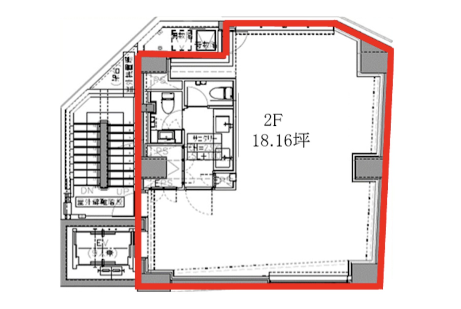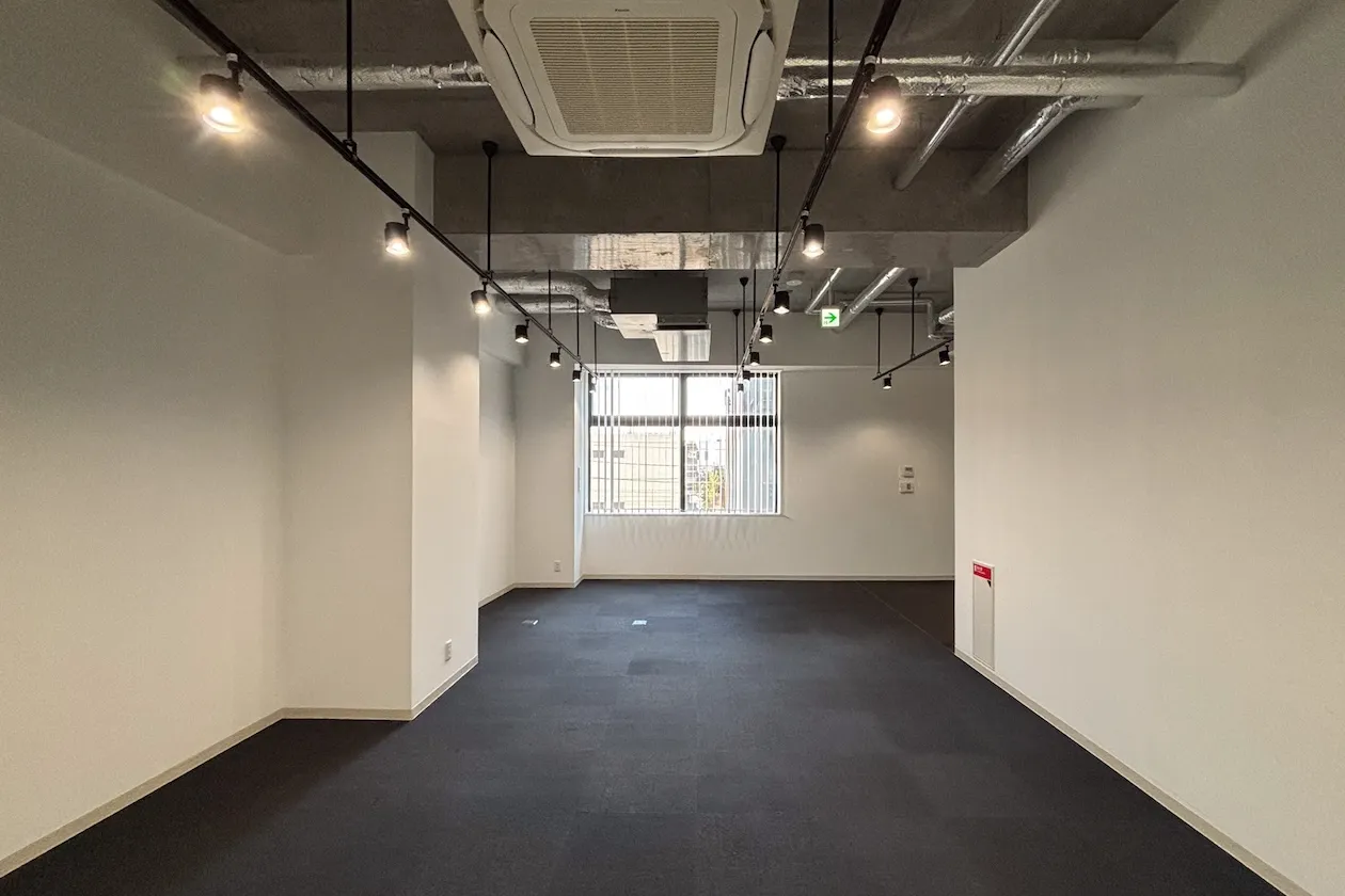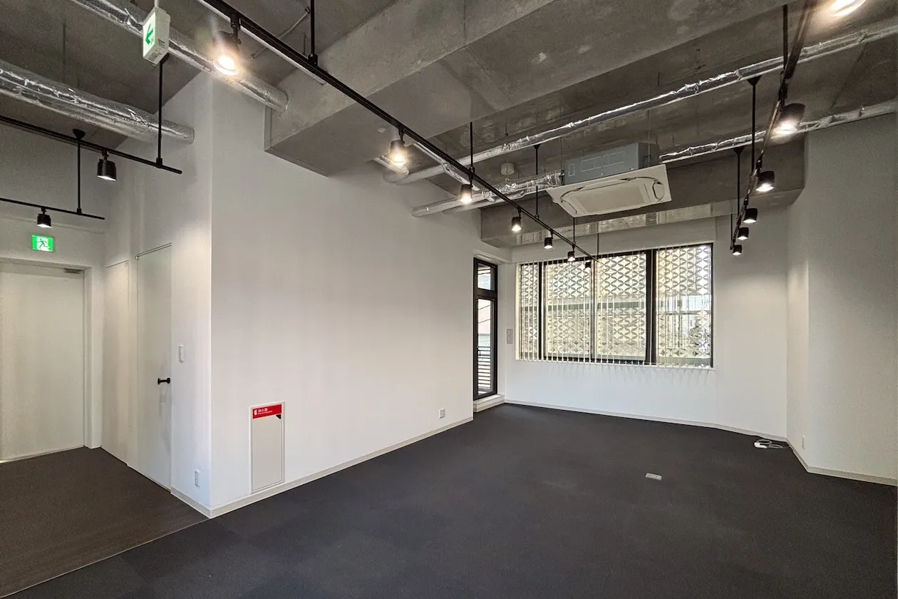 今回ご紹介するのは2階部分。最初に目に入るのは高い天井部分。一番高いところで3.3mあり、18坪のオフィスとしては非常に珍しい設計かと思います。1フロア1テナントのため窓面も多く、開放的な空間が広がります。OAフロアの上にタイルカーペット仕上げ。天井はRC物件らしく、綺麗なコンクリートが剥き出しとなっています。