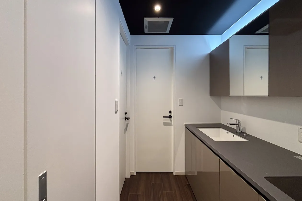 また広々とした水回りエリアも、このサイズのオフィスとしては希少です。流し台と洗面台が並び、トイレも男女別で使用可能。メインスペースから扉で隔てられている点も好印象です。