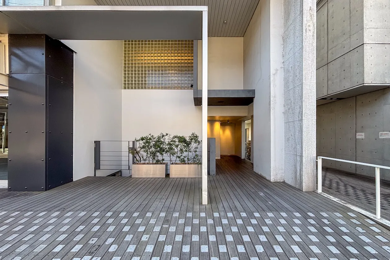 東横線自由が丘駅から徒歩3分ほど。住宅街に入っていく少し手前に大きなルーバーが印象的な建物が現れます。前面がウッドデッキやタイルで綺麗に整備されたこの建物は実は1966年築。2002年に耐震補強、2005年に内外装のリノベーションが施され今の姿になりました。