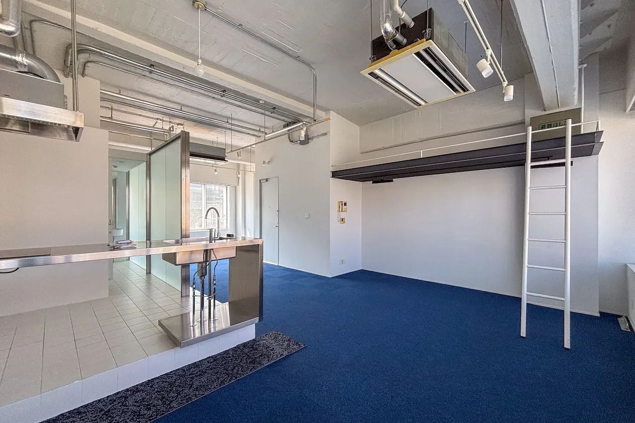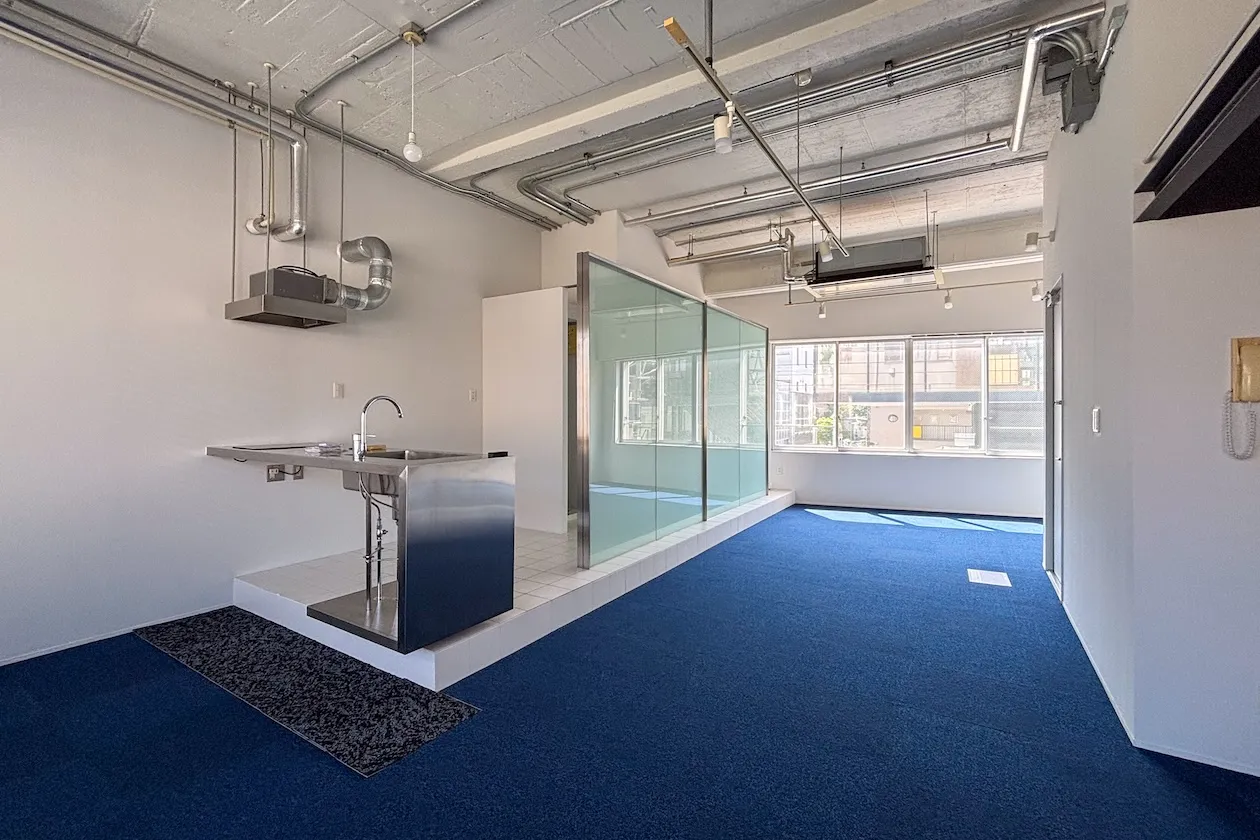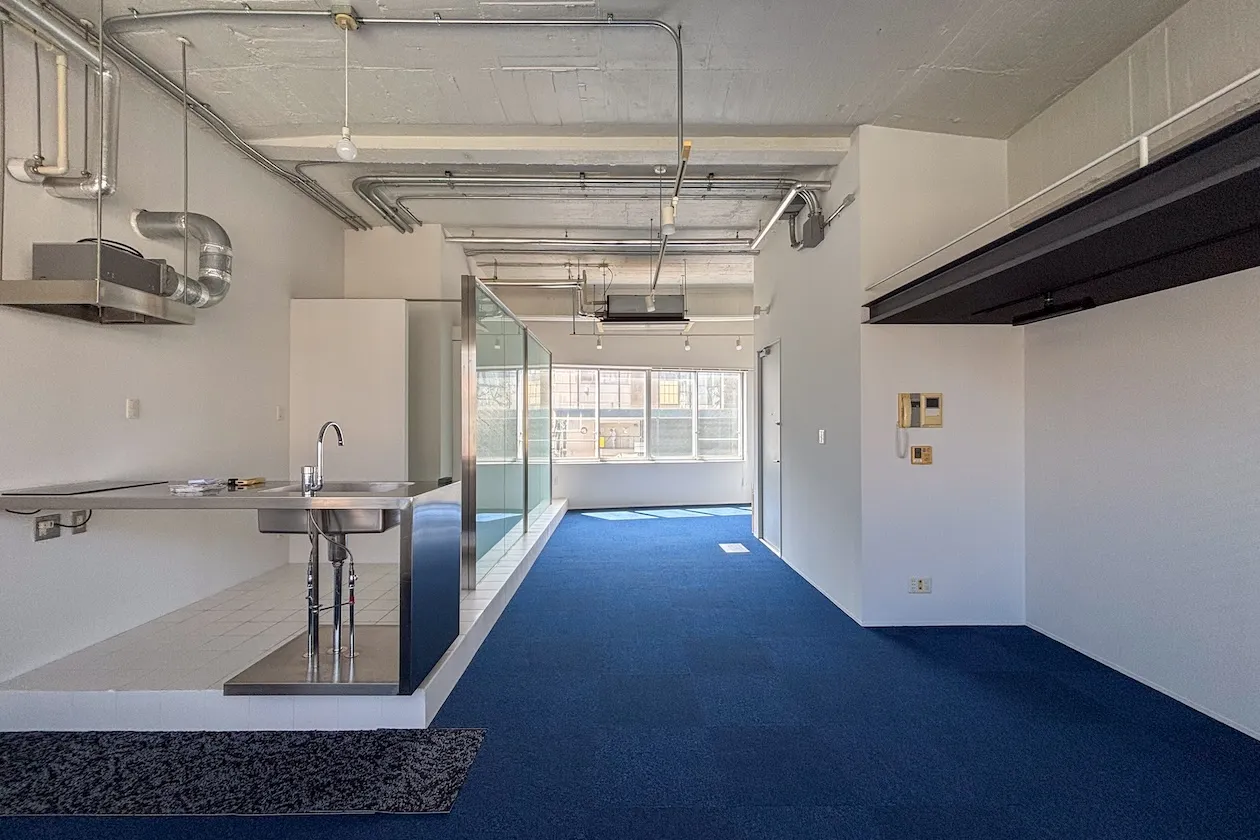 この記事でご紹介するのは2階角の55㎡の区画。広々としたワンルームです。壁と天井は白く塗装され、天井は荒々しい、ざらざらした感じも残っています。床はブルーのタイルカーペットが敷かれていることもあり、室内は爽やかな印象を受けました。