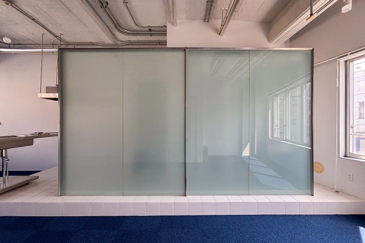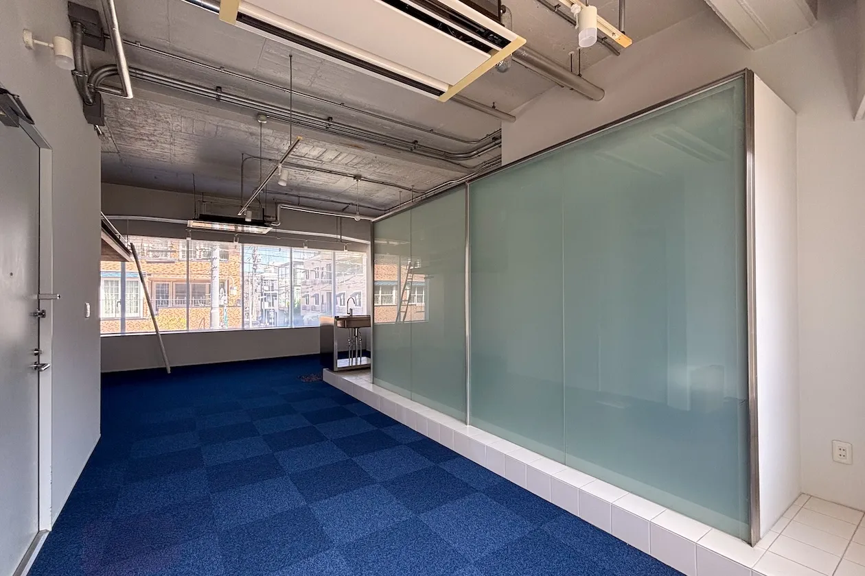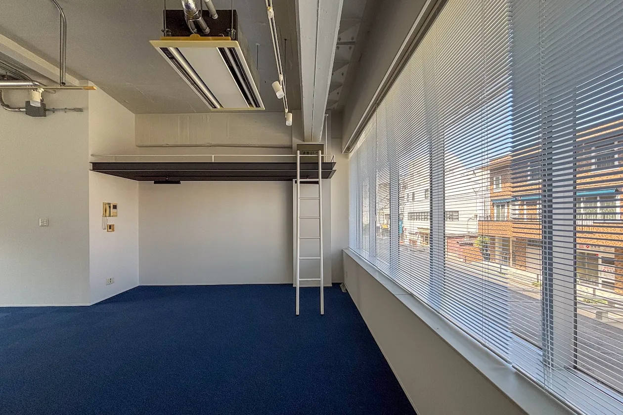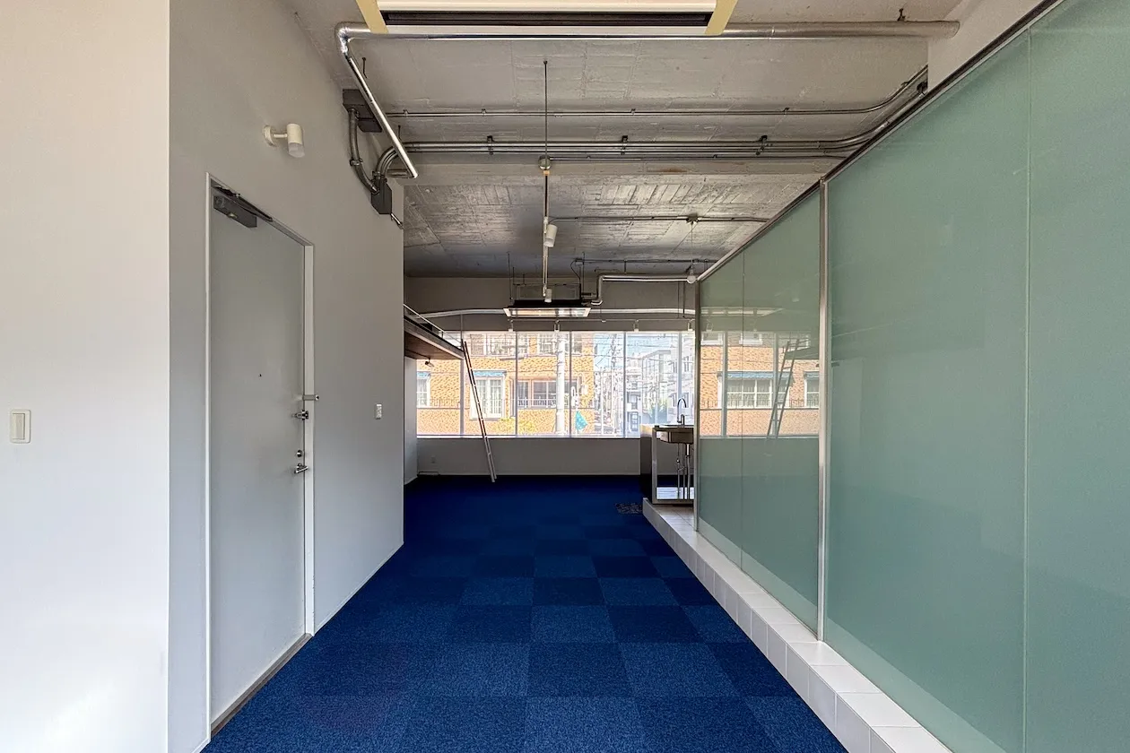 この記事でご紹介するのは2階角の55㎡の区画。広々としたワンルームです。壁と天井は白く塗装され、天井は荒々しい、ざらざらした感じも残っています。床はブルーのタイルカーペットが敷かれていることもあり、室内は爽やかな印象を受けました。