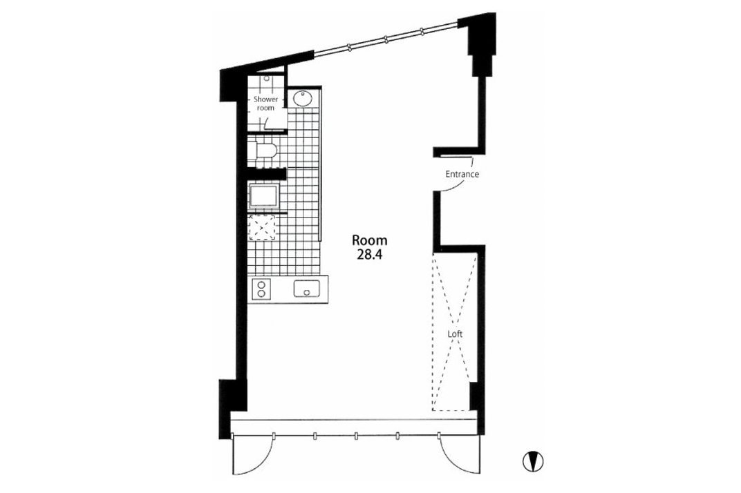 剥き出しの配管類やシャープなキッチン、水回りエリアと室内を分けるガラスパーテーションの枠はシルバーで統一され、空間のアクセントになっていました。小さなロフトは荷物を置くスペースとしてもちょうど良さそうです。シンプルな空間ですので、アクセントに存在感のある照明を加えてもいいですね。