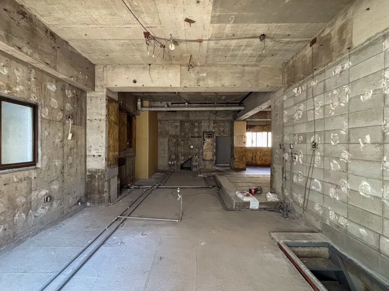 元々はオーナーが営む精肉店だったというこちらの店舗。L字型の間取りは通りに面した部分が店舗、奥が作業場だったのでしょうか。通りに面した部分にオレンジ色のタイルが残されており、ショーケースを置いた店舗の様子が浮かびます。