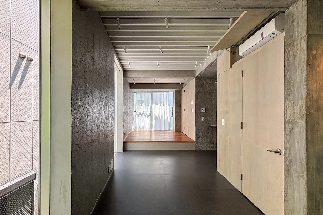 35㎡のワンルームタイプのお部屋は、長方形の空間に段差がつけられ柔らかく二つの空間に分かれています。入口側はチャコールグレーのフロアタイルが使用され、およそ30cm床の上がった奥の区画は温もりあるフローリング仕様となっています。