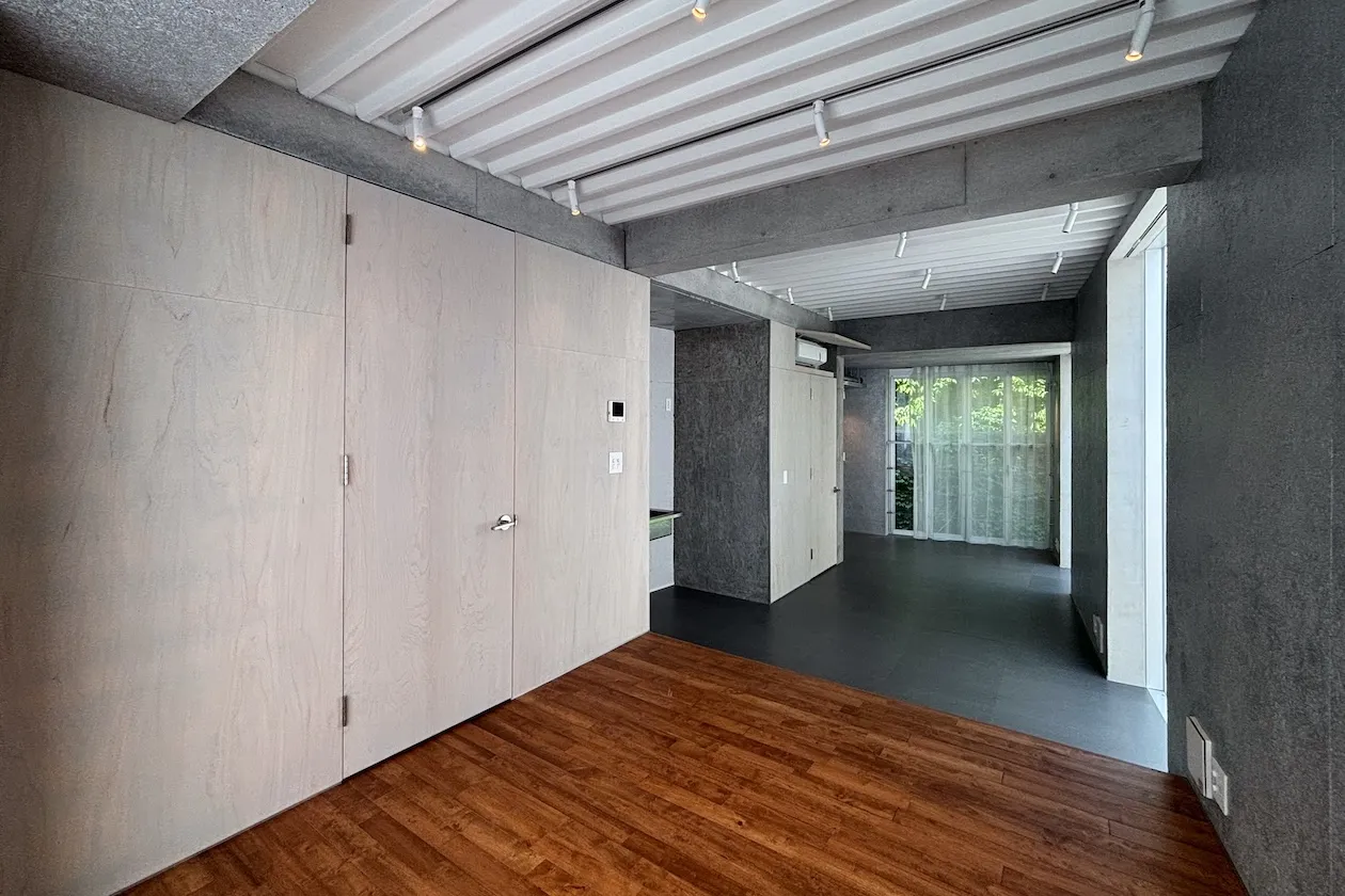 壁の部材、色味は他のお部屋と同様ですが、照明は他のお部屋と異なり、ダクトレールが手前から奥にかけて、平行かつほぼ等間隔で設置されていました。なお天井は一番高いところでおよそ2.8m。床が高くなっているところでも2.5mほどあるため空間は大きく感じます。
