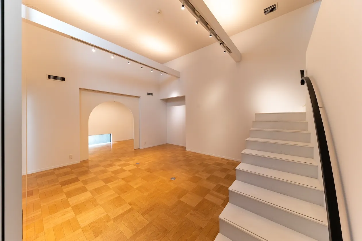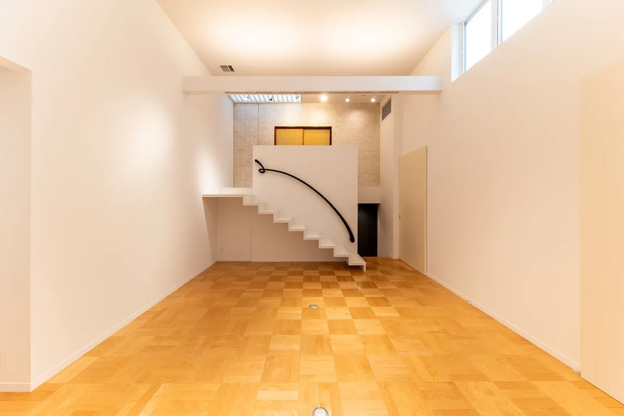 オーナーがアートギャラリー兼住居として使用していたという建物は、室内の細部までこだわりを感じます。まずやはり気になるのはアートギャラリーとして使用されていた区画。ここではメインリビングという言い方をしていますが、ギャラリーらしく大きな白の壁面に高い天井という形の綺麗な空間が広がります。パーケットフローリングと奥の階段の手すりが空間のアクセントになっていまね。