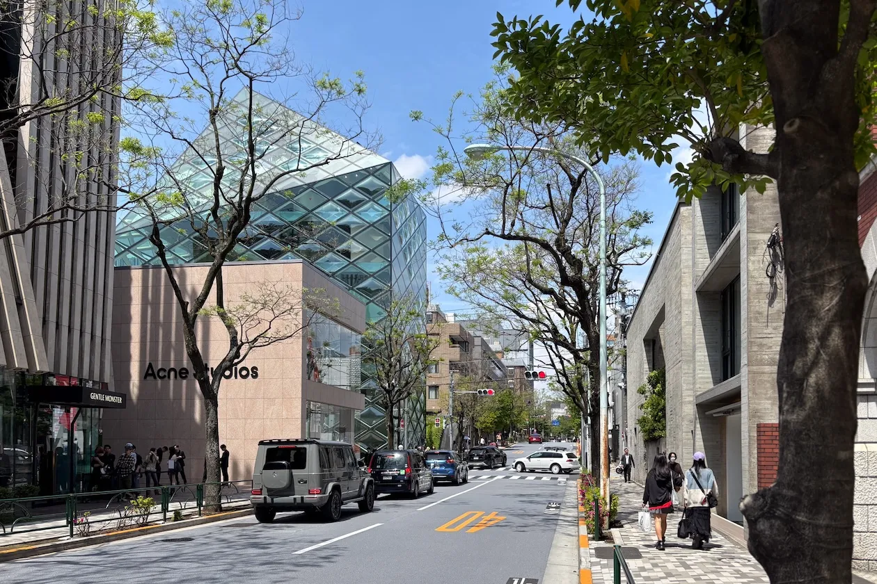 表参道駅からみゆき通りを根津美術館方面へ歩くと、誰もが知るラグジュアリーブランド、また日本の有名アパレルブランドが軒を連ねます。平日休日問わず、多くの人々が行き交う活気あるエリアです。