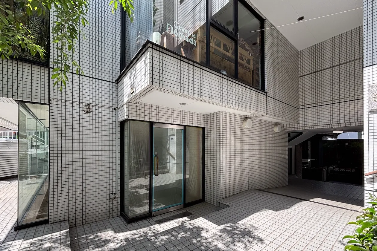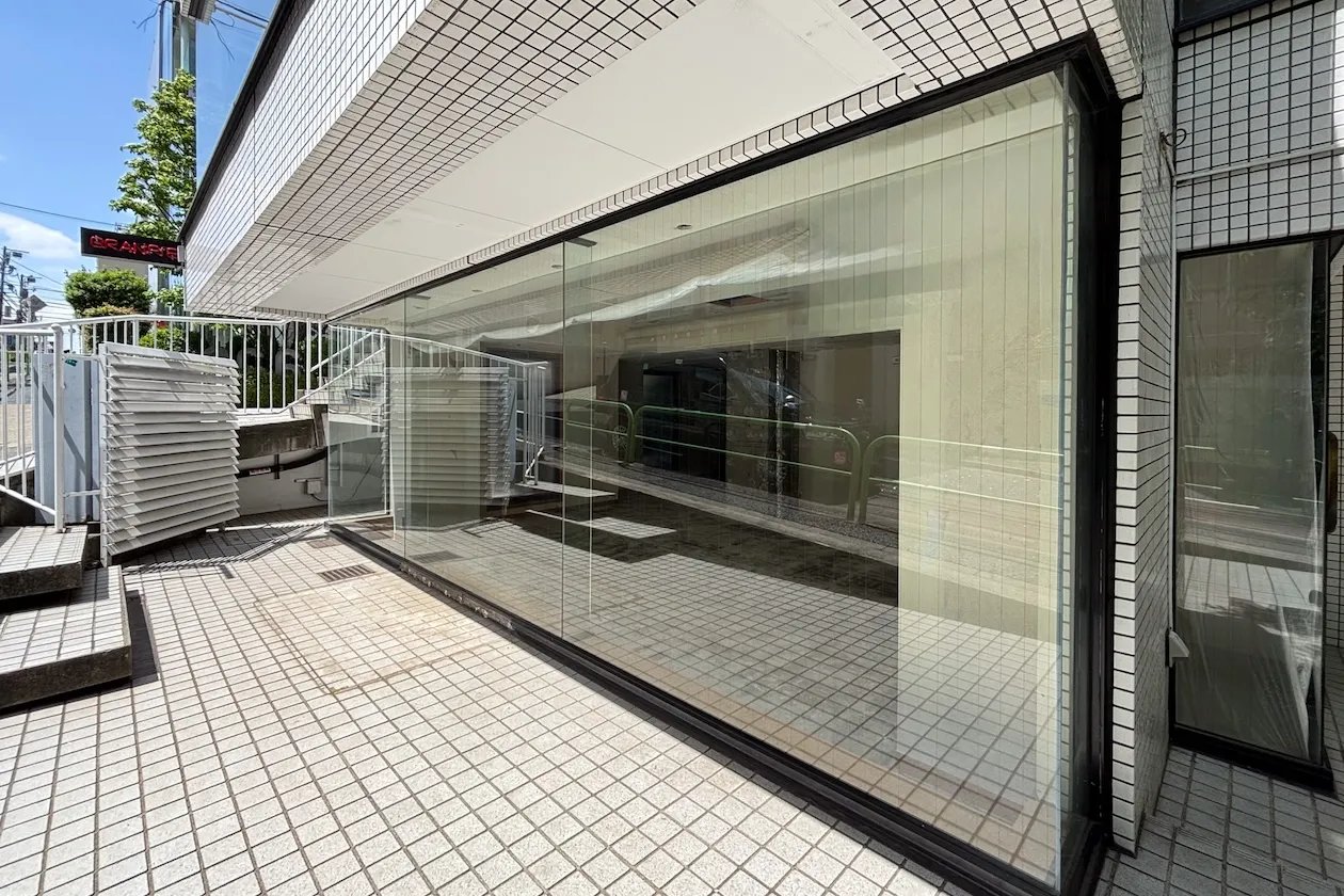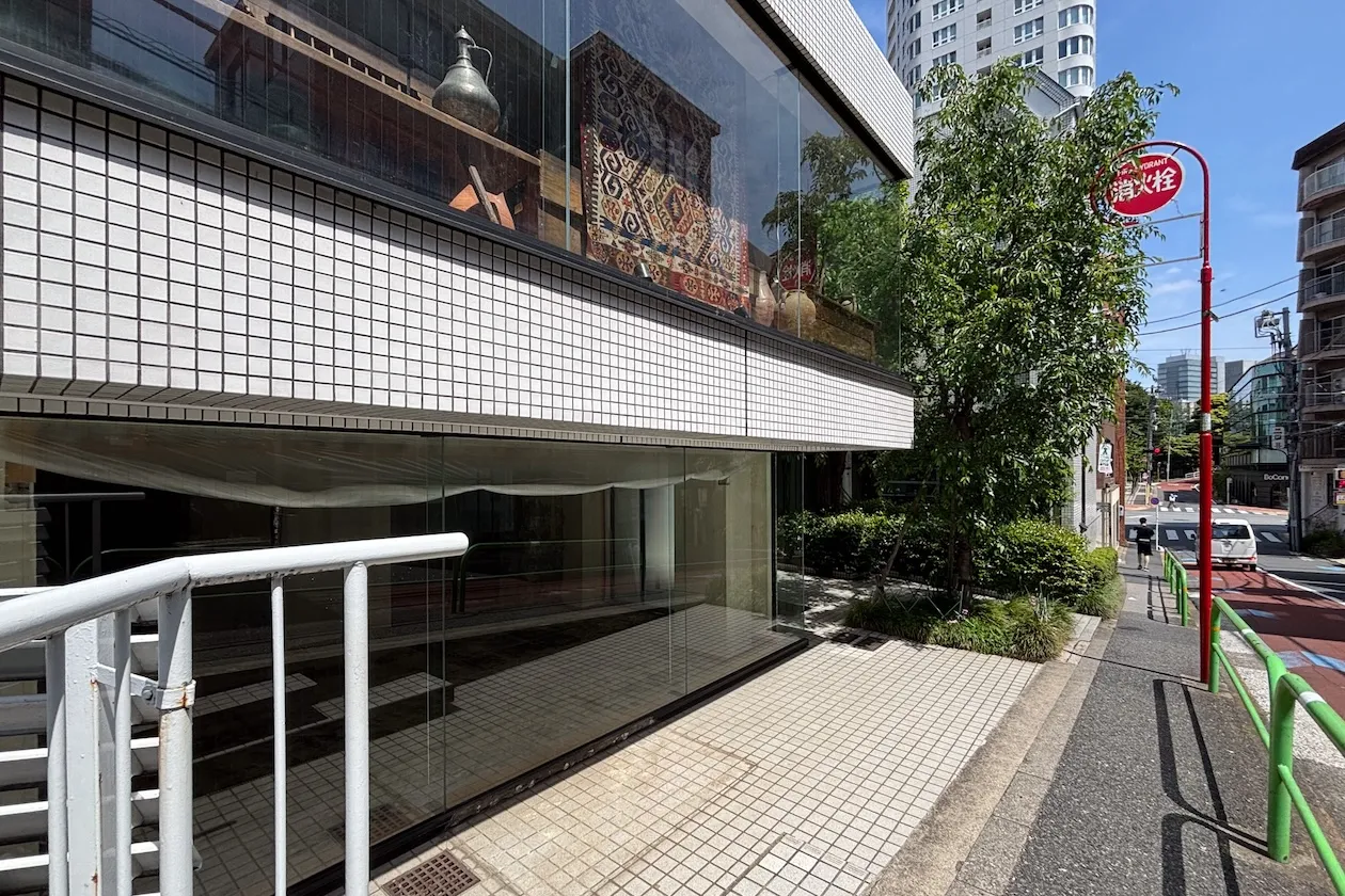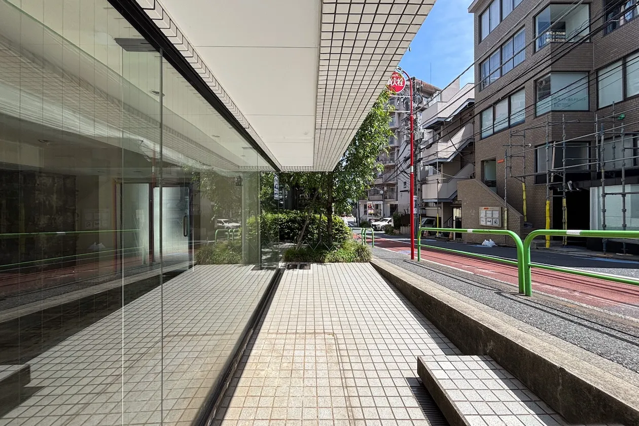 傾斜地に建つ白いタイル張りの建物。中央に建物のエントランスと大きな木があるからか、反対側の歩道から見ると、二棟の建物があるようにも感じます。この記事でご紹介するのは向かって左側の1階店舗区画です。