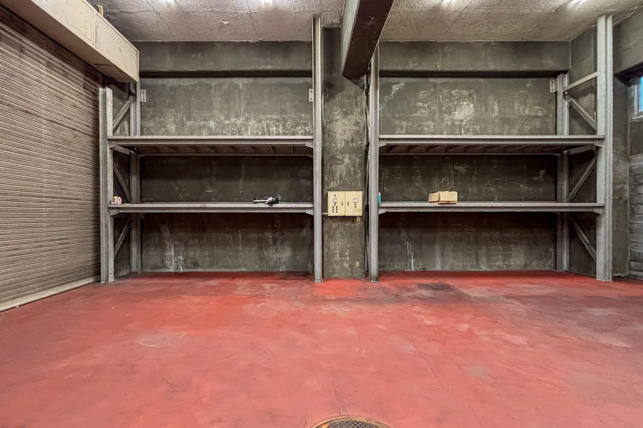 1階の大きなシャッターの先には天井高最大5.3m、梁下でも4.3mほどの大きな空間が広がります。以前はオーナー様が倉庫兼オフィスとして使用されていたとのこと、この大きな空間は商品を保管する場所として使用されていたそうです。壁面には当時使用されていた棚も残っています。