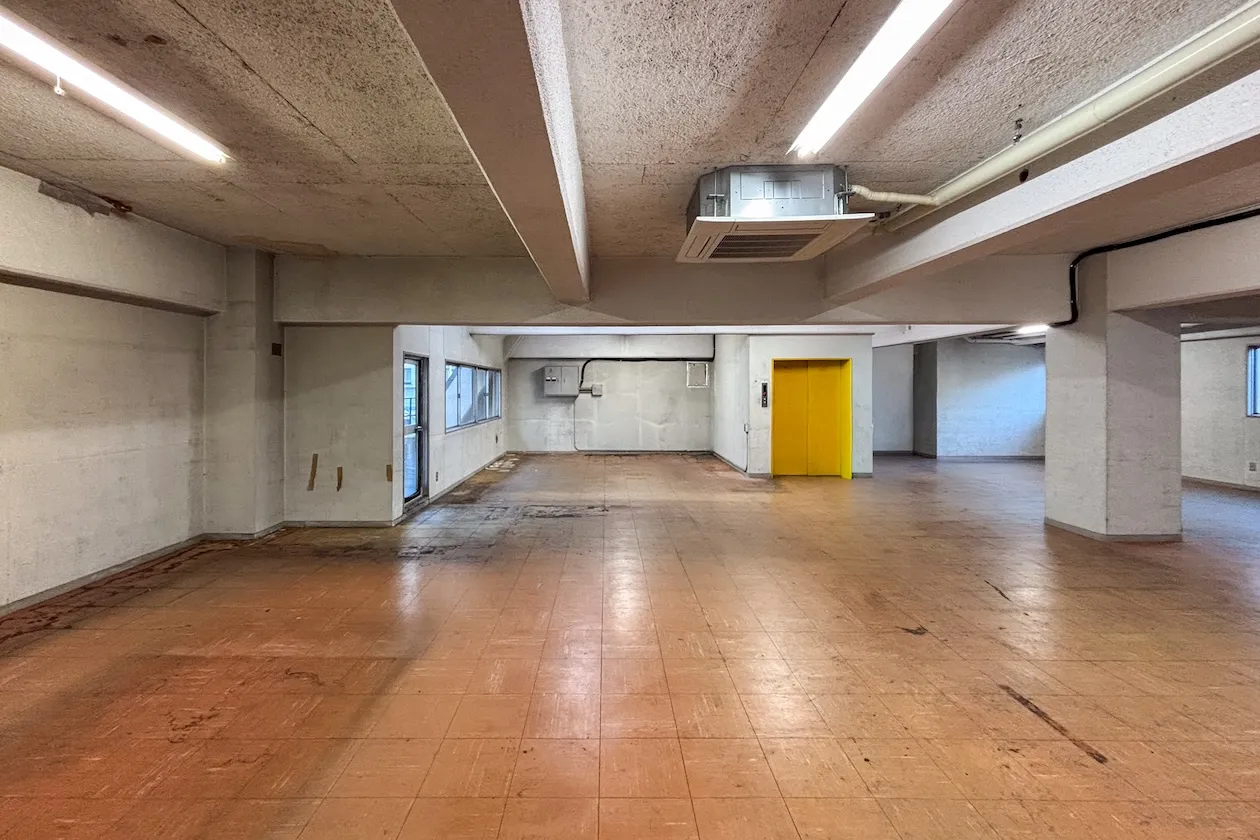 3階はワンフロア約40坪のオフィス。正方形に近い空間です。1階から直通のエレベーター、もしくは建物の共用階段を使用して入室できます。天井高は高いところで2.6mでした。現状引き渡しとのことですので内装には手を加える必要がありそうですが、エアコンは比較的新しめですので長く使えそうです。