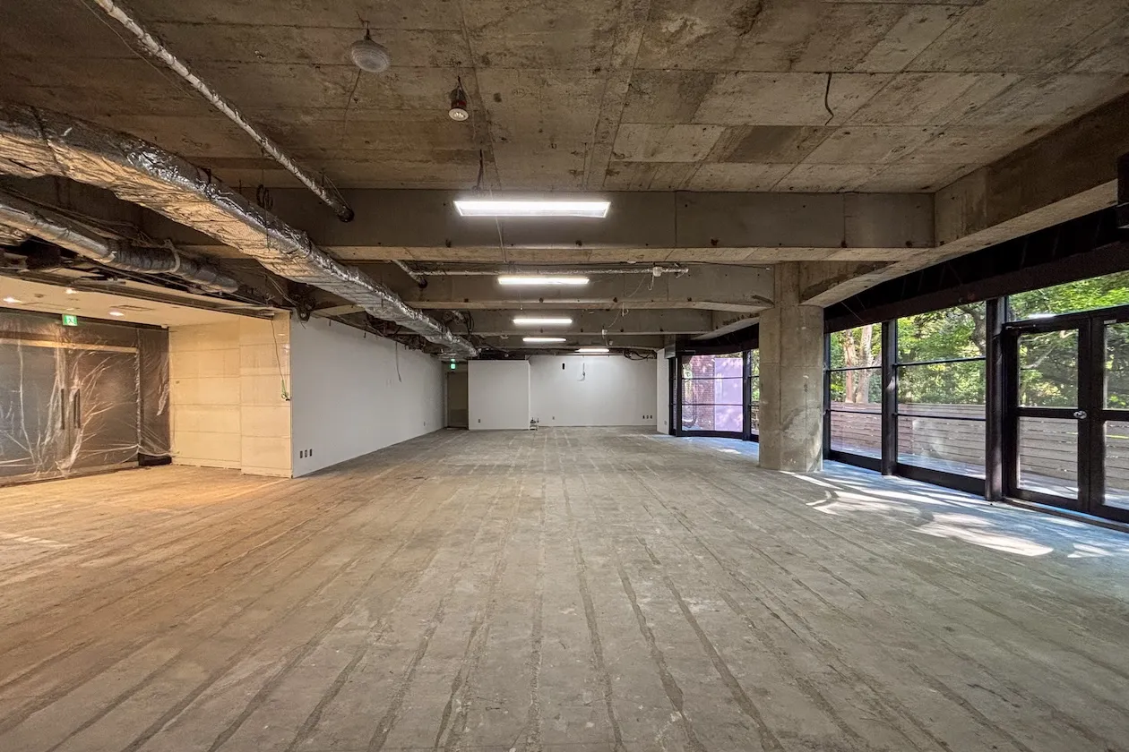 大小さまざまな木々の緑に包まれ、赤茶色のタイルが張られた重厚な外観。今回はエントランス向かって右側、230㎡の店舗事務所区画をご紹介します。