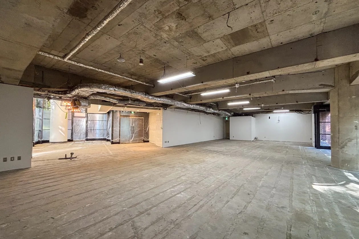 奥の広々としたメインスペースは形も綺麗でレイアウトの自由度は高そうです。スケルトン引渡しではありますが、床や天井は比較的綺麗なため、敢えてラフな空間作りをされたいと考えている方は、床を均して防塵塗装を施し、エアコンとダクトレールを付けるだけでも雰囲気ある空間は作れるのではと思います。天井は一番高いところで3.4mほどありました。