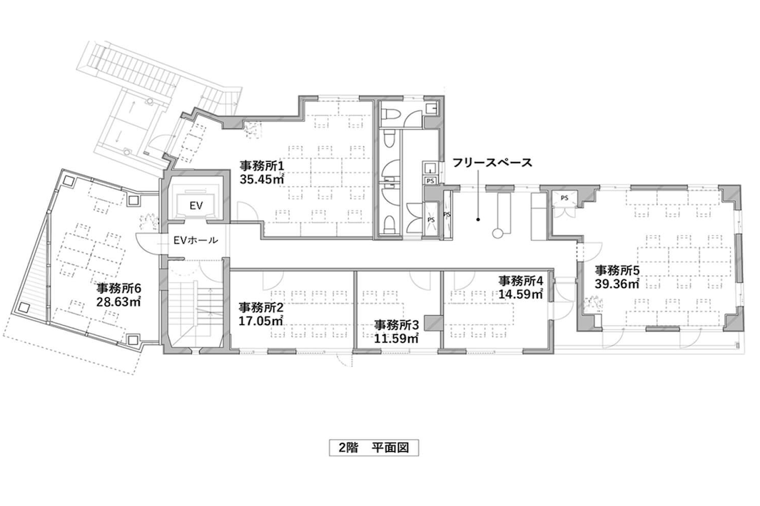 | 契約面積 | 事務所1 35.45㎡(10.72坪) 事務所2 17.05㎡(5.15坪) 事務所5 39.36㎡(11.9坪) |