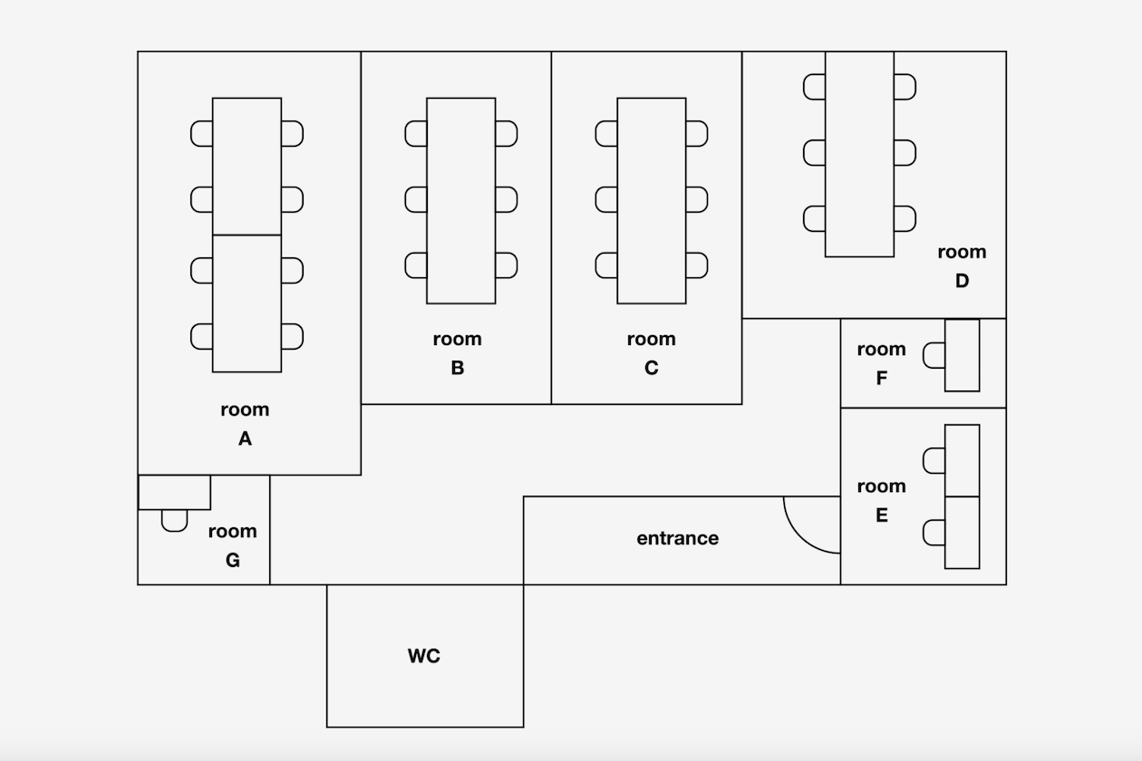 白を基調とした清潔感ある空間は全部で7区画。定員が1〜8名の計7区画に分かれています。1名用の1部屋を除き、すべての区画に窓があり、眺望も良く、気持ちの良い空間です。