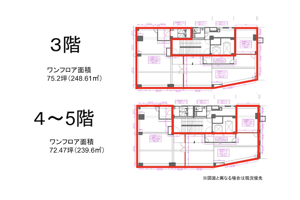 今回ご紹介するのはワンフロア72〜75坪の3フロア分(220坪)です。それぞれ繋がっていない別々のフロアですが、現状はまとめてのご案内となっています。